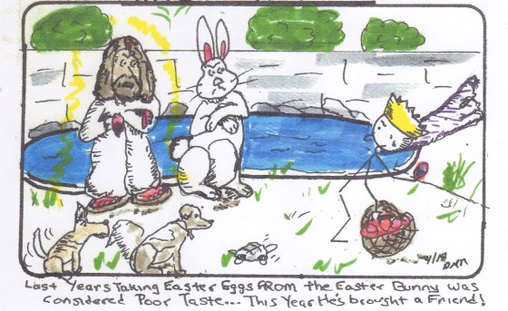 “Last years taking Easter Eggs from the Easter Bunny was considered poor taste…This year he’s brought friends! This illustration is actually an Easter card I created for family.  It is a followup to the 2011 version where the Easter Bunny is forced to gather Easter Eggs for The Queen.  It is also  a first in […]