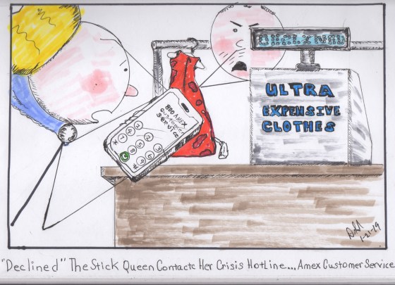 “Declined…The Stick Queen Contacts Her Crisis Hotline…Amex Customer Service!” We’ve all seen it before…Incredulity sets in…This is got to be some horrible mistake!